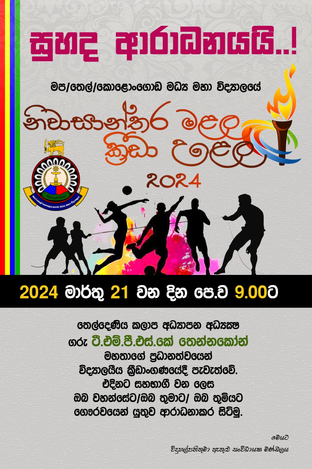 අප විද්යාලයේ නිවාසාන්තර මළල ක්රීඩා උළෙල 2024 මාර්තු මස 21 වන දින පෙ.ව.9.00 ට කලාප අධ්යාපන අධ්යක්ෂ ගරු ටී.එම්.පී.එස්.කේ.තෙන්නකෝන් මහතාගේ ප්රධානත්වයෙන් විද්යාලයීය ක්රීඩාංගණයේදී පැවැත්විණී.
